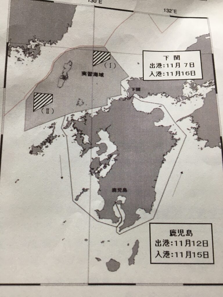 これが航海の日程です。このようなルートで航海しました。母港の下関港を出てから九州西部を