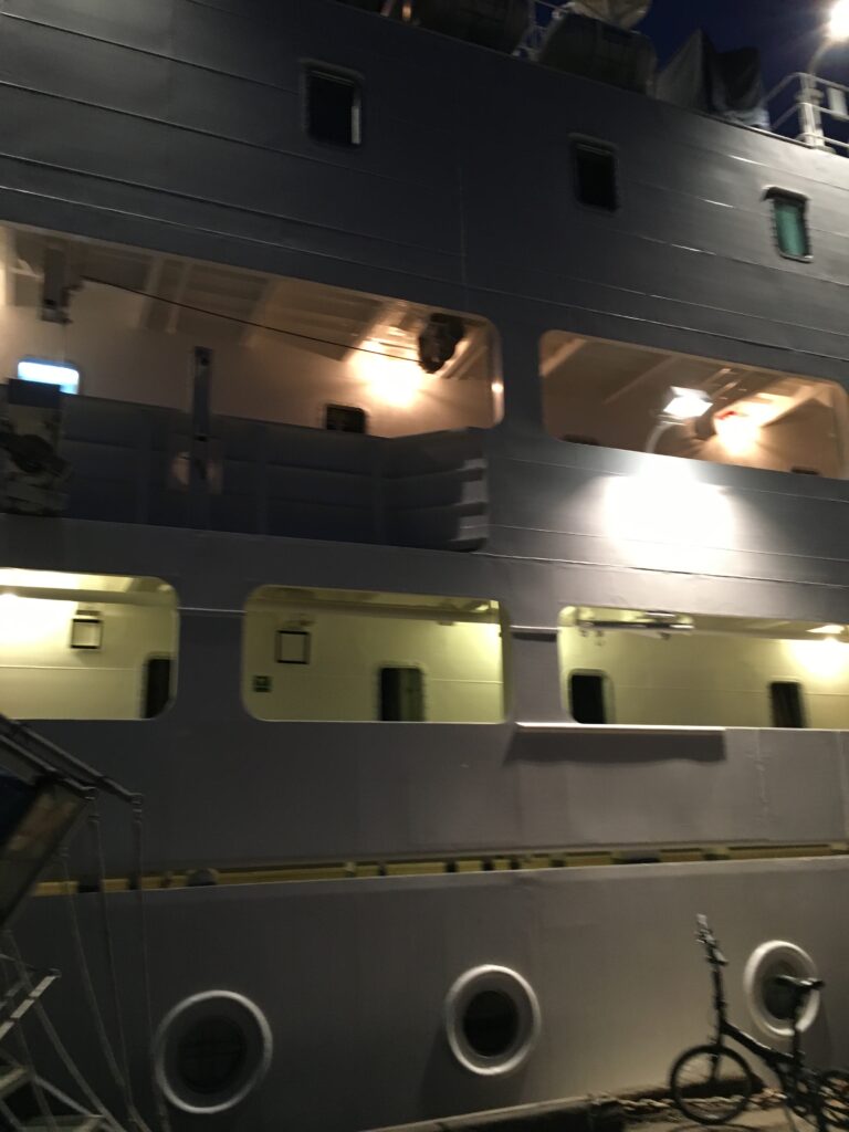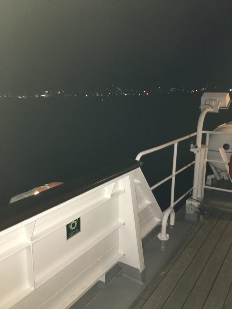 This is a photo of the ship at night. It’s beautifully illuminated and looks stunning.