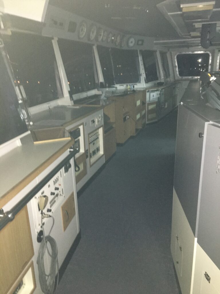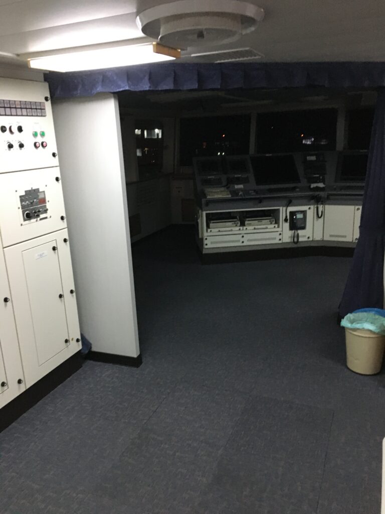 This is the bridge of the ship. A wide range of navigation instruments are lined up here. The officers and the captain operate and navigate the ship from this location.