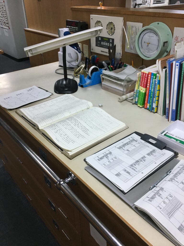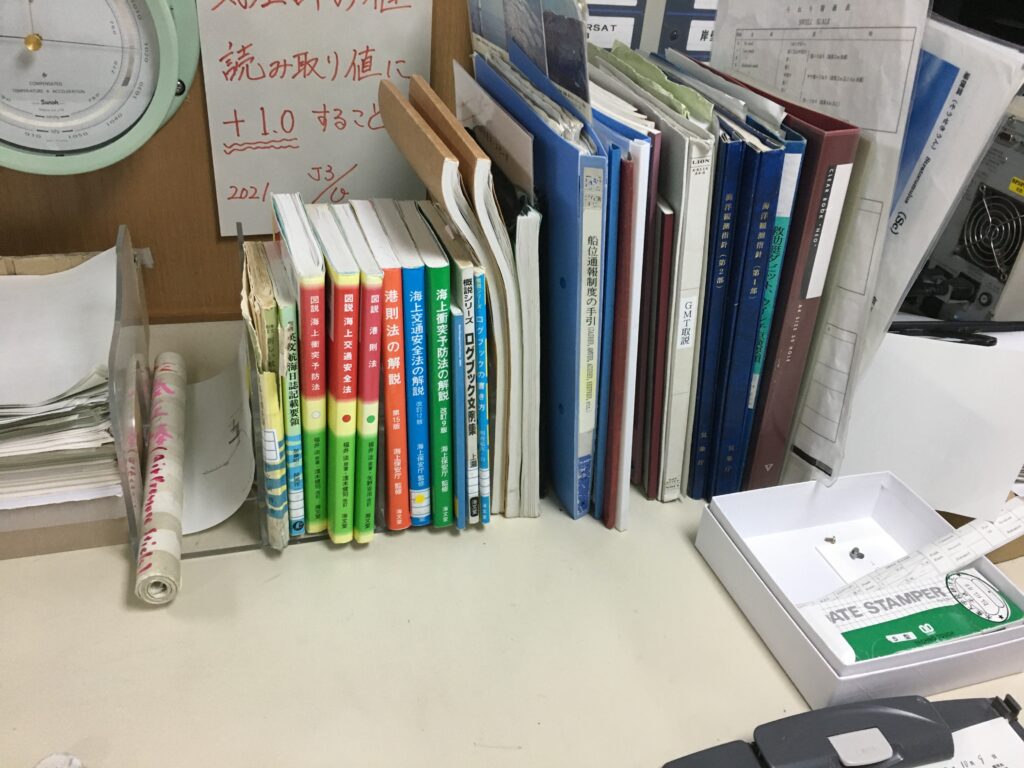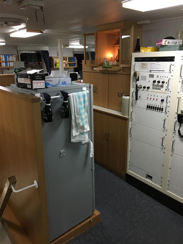 This is the space located behind the ship’s navigation room. It contains a chart table, logbooks, and other equipment. There is also a small kitchenette where coffee is made. When navigating the ship late at night, it’s easy to get sleepy, so trainees make and drink coffee here to stay alert.