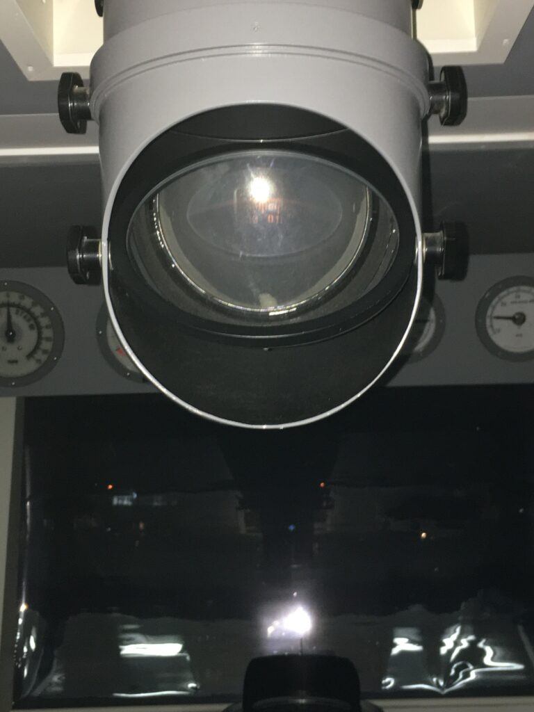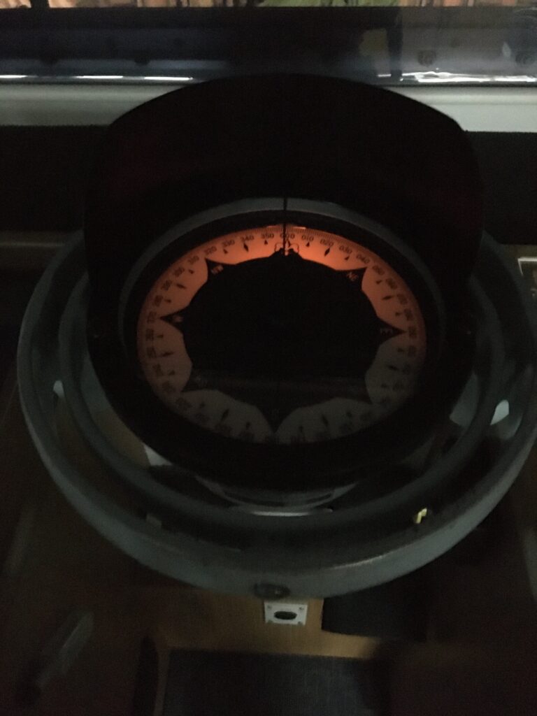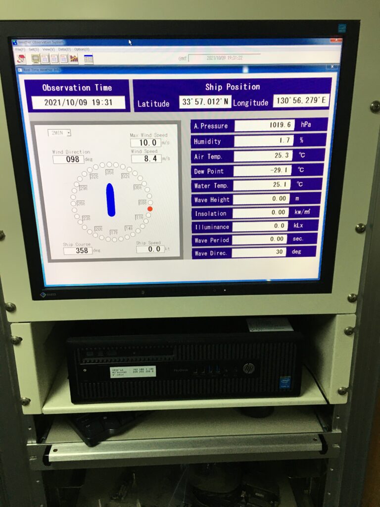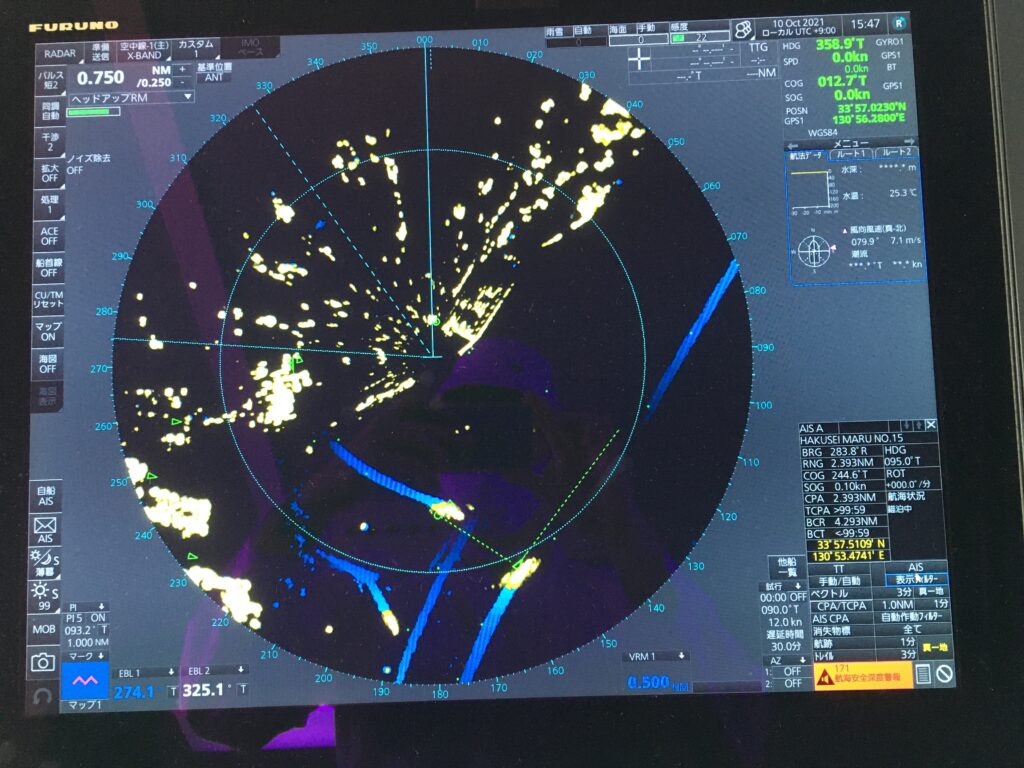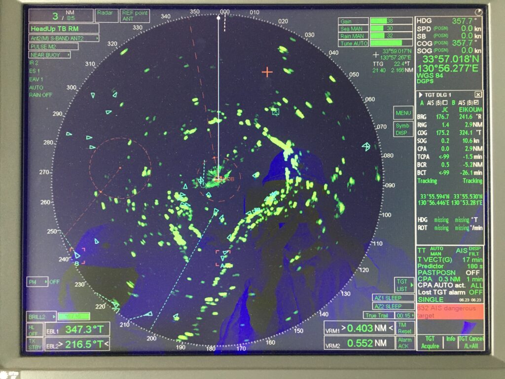 This is the ship’s radar display. Ships and land detected by the radar are shown on the screen.